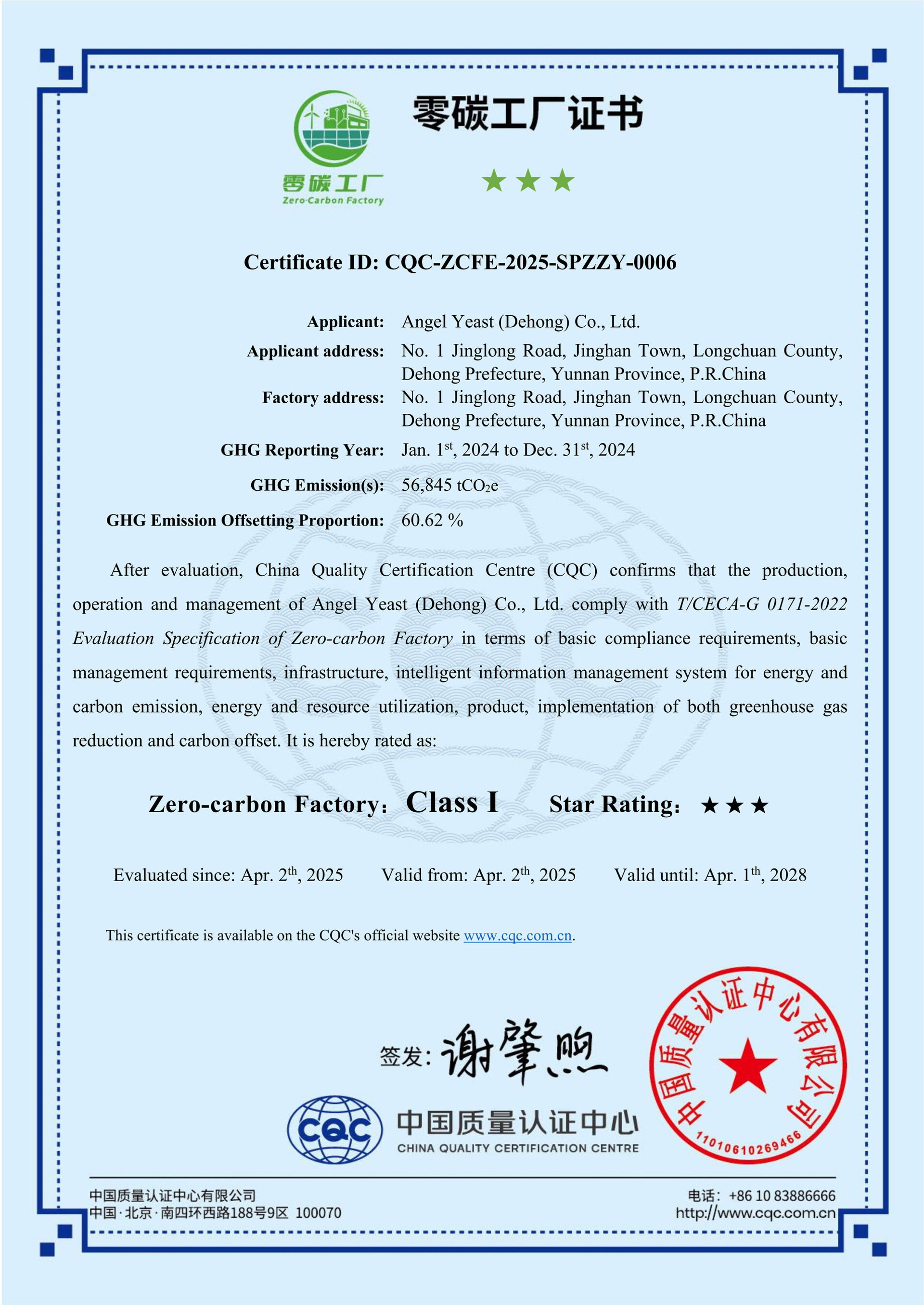 El 2 de abril, el Centro de Certificación de Calidad de China designó oficialmente a Angel Yeast Dehong como "Fábrica de Carbono Cero" de clase I y tres estrellas. Este hito supone la primera fábrica de cero emisiones de carbono de Angel Yeast y marca un paso importante en la dedicación de la empresa a las prácticas ecológicas y de bajas emisiones de carbono y a la promoción del desarrollo sostenible.