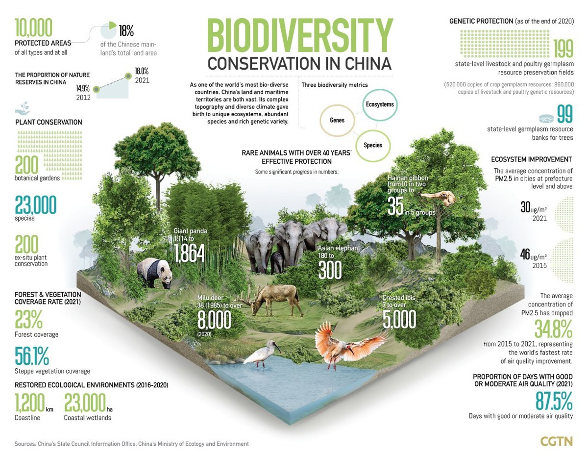 Según el libro blanco sobre Conservación de la Biodiversidad, China ha establecido 10 programas piloto para el sistema de parques nacionales desde 2015, cubriendo un área de 2,2 millones de hectáreas. Una variedad de especies en peligro de extinción, como los pandas gigantes y los antílopes tibetanos, están bien protegidas en el área. Además, China ha establecido cerca de 10.000 reservas naturales, que representan alrededor del 18 por ciento de la superficie terrestre total.