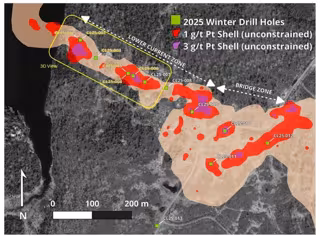 El programa de perforación de invierno de 2025 está estratégicamente diseñado para aumentar el tamaño, el número y la ley de las zonas de alta ley cercanas a la superficie en el depósito Current, basándose en los sólidos resultados del programa de verano de 2024. Los últimos hallazgos, junto con los datos anteriores, validan aún más la extensión de las zonas mineralizadas más allá del alcance del modelo de recursos más reciente (informe técnico NI 43-101 sobre el Proyecto Thunder Bay North, Ontario, Canadá, SLR Consulting Canada Ltd, 19 de junio de 2023).