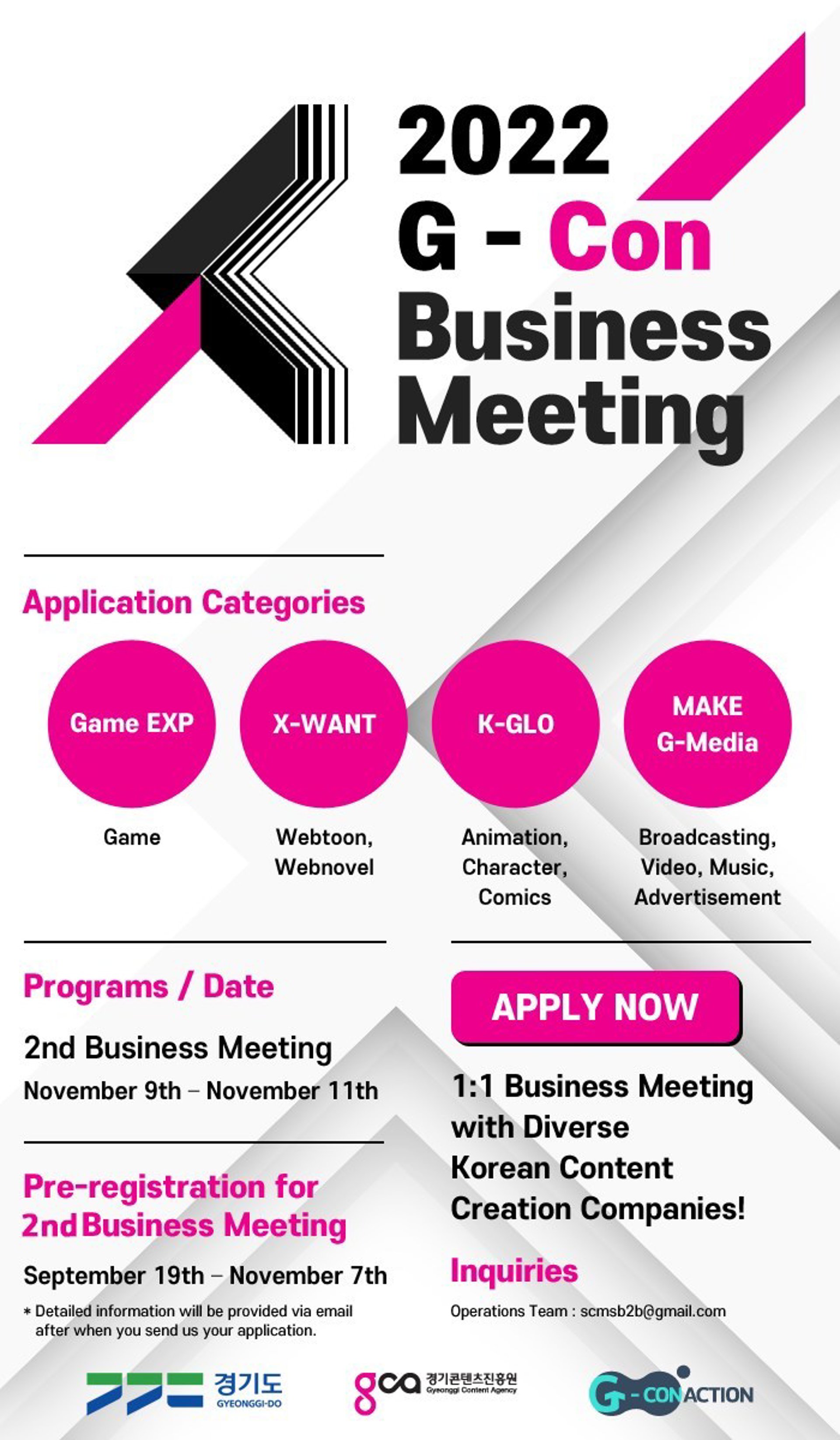 El G-Con Action Business Meeting es una reunión de negocios global y un encuentro organizado por la GCA para facilitar y ampliar las oportunidades de negocio de la industria de contenidos, poniendo en contacto a las empresas de contenidos coreanas con posibles socios del sudeste asiático, China, Japón, Europa y América. Las cuatro categorías para los solicitantes son: GameEXP (videojuegos), K-GLO (animación/caricatura/caracteres), X-WANT (webtoon/novela web) y MAKE-G (broadcast/música/visual/publicidad).