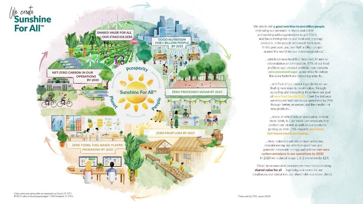 SINGAPUR, 12 de agosto de 2021 /PRNewswire/ -- Dole Sunshine Company* ha publicado hoy su primer Sunshine for All Progress Report, un año después del anuncio de "The Dole Promise." Su promesa de seis puntos impulsa a la empresa de 170 años a aumentar el acceso a la nutrición sostenible, a reducir los residuos de alimentos, los plásticos en los envases y las emisiones de carbono, y a aumentar el valor para las partes interesadas de la empresa.