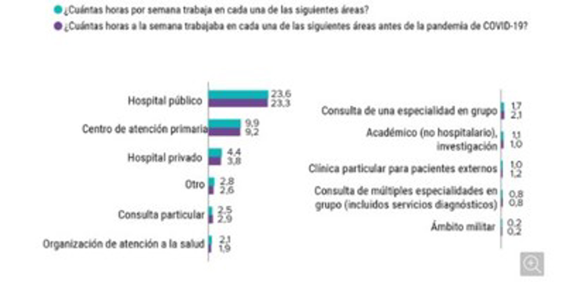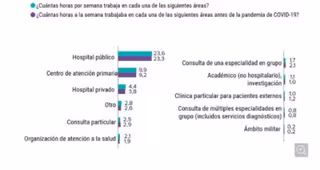 - En general, el cómputo de horas semanales trabajadas era de 49 antes de la pandemia, aumentando en casi una hora en la actualidad. Este aumento se vió reflejado pricipalmente en Centros Hospitalarios Públicos, al igual que en la atención primaria.