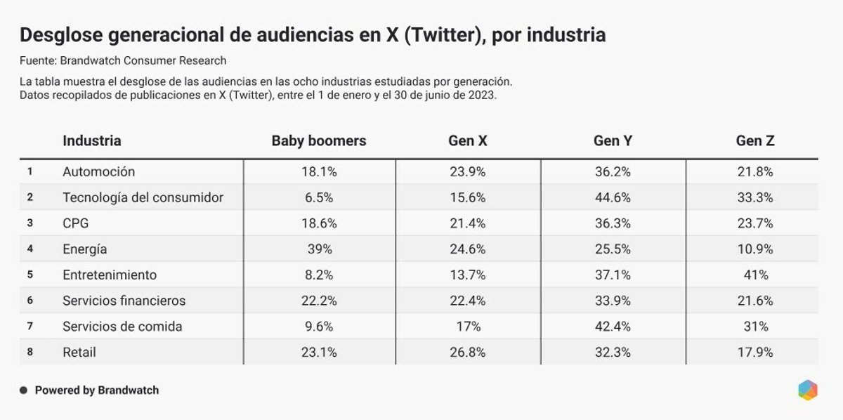 Análisis realizado con Brandwatch Consumer Research para marcas líderes de 8 sectores diferentes: automoción, bienes de consumo de alta rotación, tecnología, energía, entretenimiento, comercio minorista, alimentación (tradicional y rápida), servicios financieros. Datos públicos en inglés en redes sociales, blogs, foros, sitios de noticias y reseñas. El análisis se llevó a cabo del 1 de enero al 30 de junio de 2023.