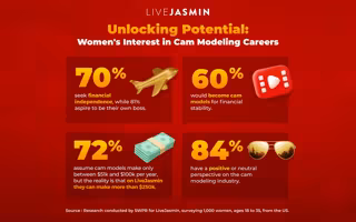 - 60% se convertirían en modelos de webcam si eso significara estabilidad financiera. La mayoría de los encuestados asumen que los modelos webcam solo ganan entre $51k y $100k al año, pero la realidad es que en LiveJasmin pueden ganar más de $250k, con muchos alcanzando incluso más de $1 millón.