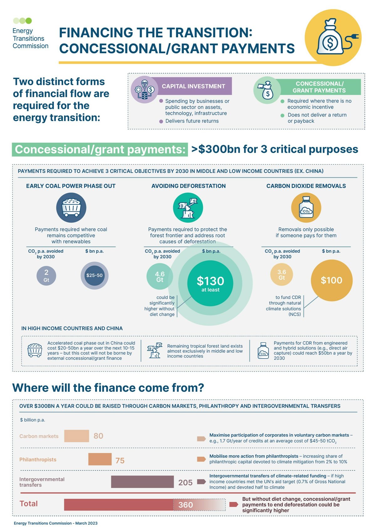 Financingthe Transition: How to make the money flow for a net-zero economy (Financiación de la transición: cómo hacer que el dinero fluya para una economía neta cero) fue publicado por ETC en marzo de 2023 y destaca que las inversiones en energía limpia deben cuadriplicarse en las próximas dos décadas según la Comisión de Transiciones Energéticas (ETC). Se necesitarán alrededor de 3.500 millones de dólares al año de inversión de capital en promedio entre ahora y 2050 para construir una economía global neta cero, frente a 1.000 millones de dólares por año en la actualidad. De esto, el 70% se requiere para la generación, transmisión y distribución de energía baja en carbono, lo que sustenta la descarbonización en casi todos los sectores de la economía. Parte de la inversión necesaria se compensará con la reducción de la inversión en combustibles fósiles, reduciendo el requisito de 3.500 millones de dólares anuales a 3.000 millones de dólares netos. Esto equivale al 1,3% del PIB global anual promedio probable durante los próximos 30 años.