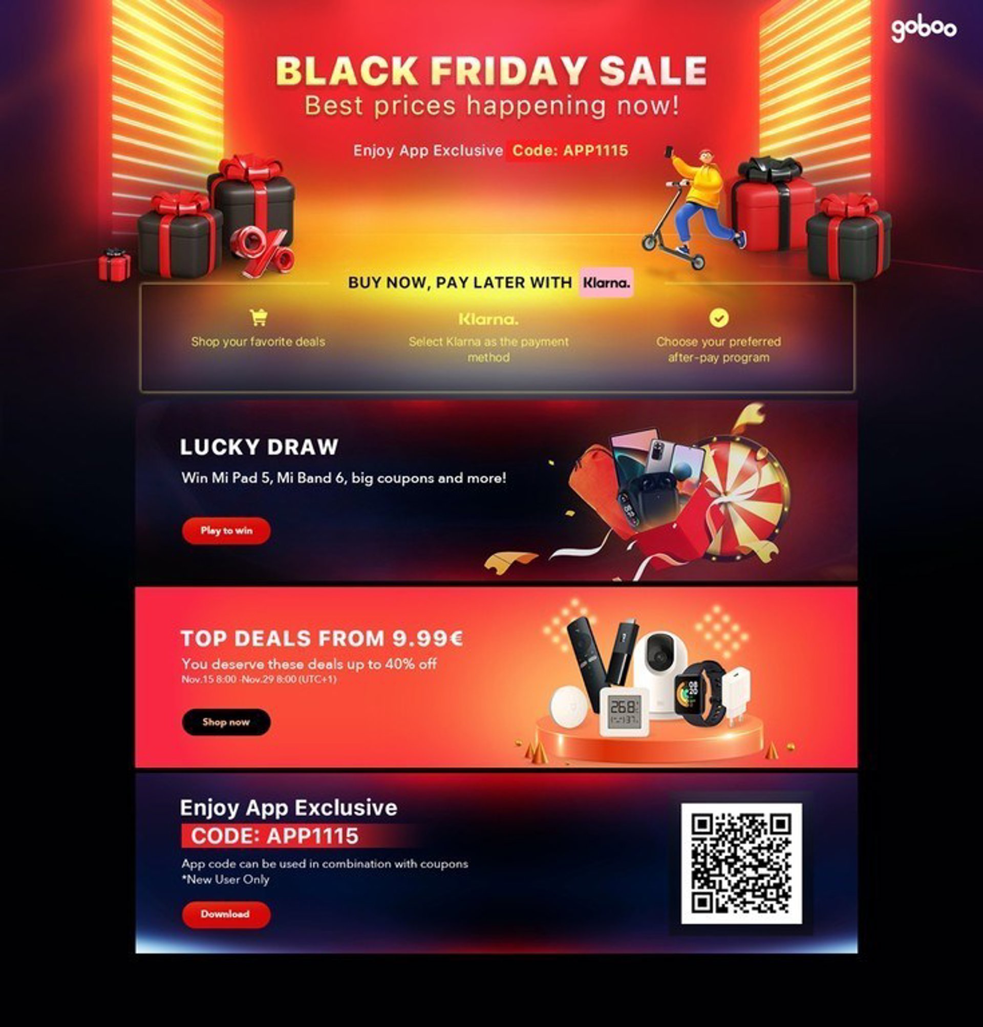 Goboo, una popular plataforma europea de comercio electrónico de teléfonos inteligentes y la última tecnología 3C, ha lanzado una venta de 10 días de Black Friday y Cyber Monday. Desde el viernes 19 de noviembre hasta el domingo 28 de noviembre de 2021, los clientes podrán disfrutar de una amplia gama de ofertas de Black Friday con superdescuentos de hasta el 45%, como el recién lanzado POCO M4 Pro 5G, Xiaomi Pad 5, Redmi Note 10 Pro, con cupones extra y descuentos exclusivos de la App.