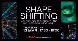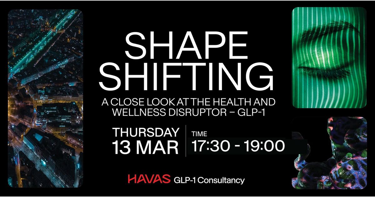 Promotional graphic for “Shape Shifting,” a Havas GLP-1 Consultancy event exploring the health and wellness disruptor GLP-1. The event is scheduled for Thursday, March 13, from 17:30 to 19:00. The design features bold white typography on a black backgroun - HAVAS HEALTH NETWORK/PR NEWSWIRE