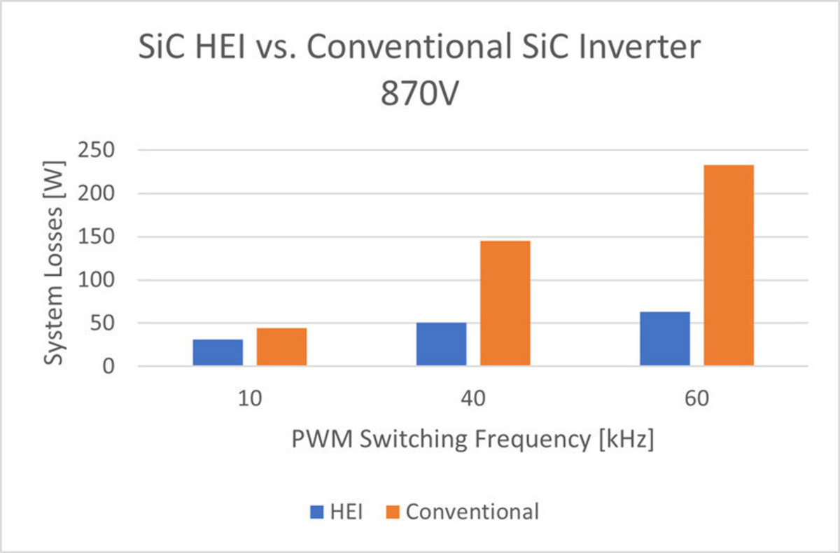 Como se ilustra en el gráfico, SiC HEI PoC reduce drásticamente las pérdidas totales del sistema a medida que aumentan las frecuencias de conmutación (de 10 kHz a 60 kHz) en comparación con un inversor de SiC convencional.