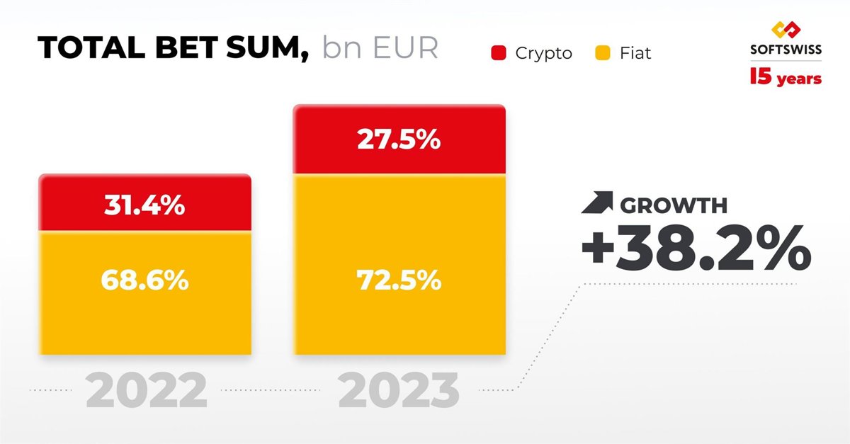 Según los datos de SOFTSWISS, el mercado de iGaming tuvo una expansión estable en 2023. En términos absolutos en euros, la suma total de apuestas creció un 38,2% interanual. Al mismo tiempo, el recuento total de apuestas mostró un aumento aún mayor, superando el 51,2%.