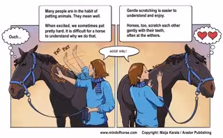 Horses' social behaviour includes friendly scratching among familiar horses. Many horse enthusiasts recognize the scene: Two horses scratching each other's withers with their teeth while relaxing to enjoy the feeling. The scene illustrates another similarity between our felt experiences and those of animals such as horses. A friendly touch is such an important component of a horse's life that research has shown horse welfare to be better if horses can touch a familiar horse instead of just having visual contact with it, such as across the aisle of a stable.
