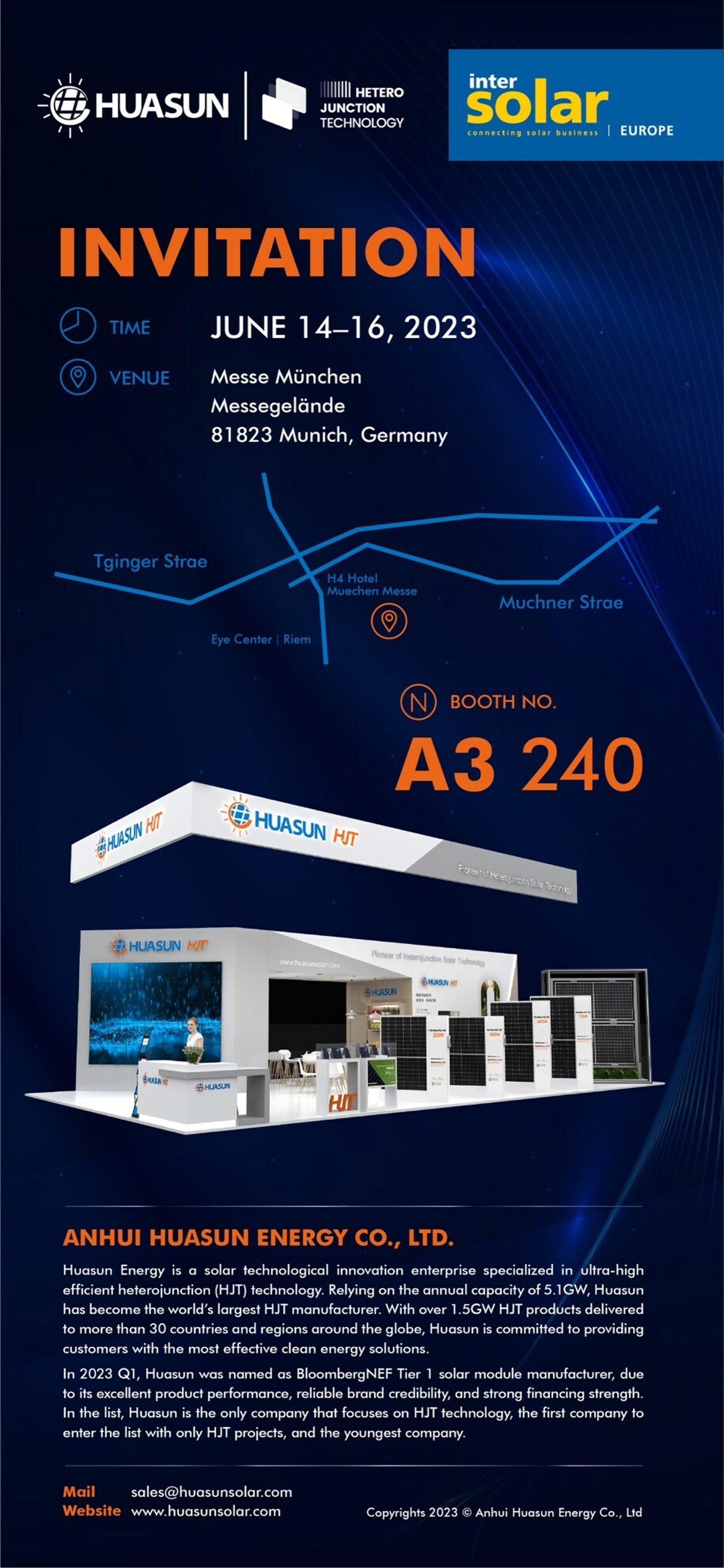 MÚNICH, 9 de junio de 2023/PRNewswire/ -- Huasun Energy, ("Huasun"), el mayor fabricante de HJT del mundo, participará en la edición de este año de Intersolar Europe, que se celebrará en Múnich (Alemania), para presentar los últimos avances de su tecnología y su gama de productos de células solares y módulos de heterounión (HJT) de silicio tipo N de eficiencia ultra alta. Los visitantes podrán descubrir cómo Huasun está revolucionando la industria fotovoltaica en el expositor A3-240.