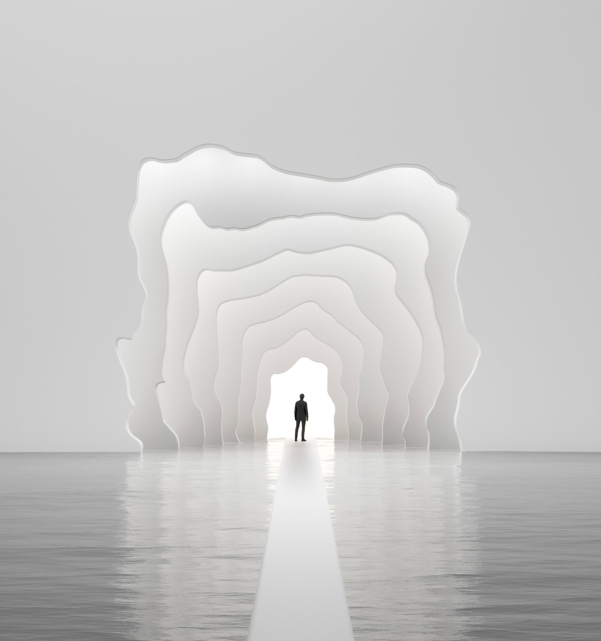 Dentro de la instalación, un estanque actúa como superficie de espejo para duplicar y reflejar la apertura del volumen cavernoso. Arsham pretende que los visitantes contemplen la aceptación del espacio y su maleabilidad, comprendiendo la relación entre los volúmenes. La cadencia de los muros imita el ritmo de las columnas del Palazzo, contribuyendo a una atmósfera completa que representa el movimiento o el flujo.