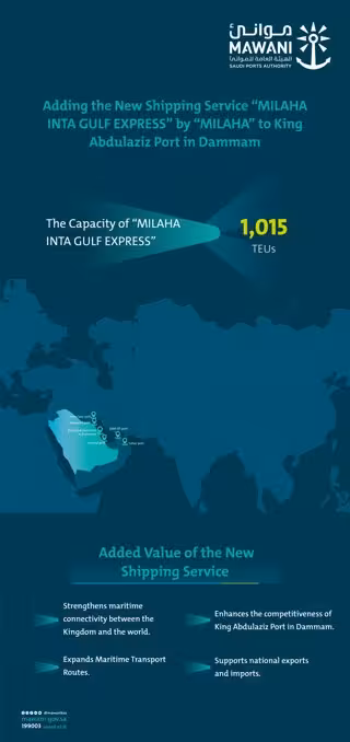RIYADH, Saudi Arabia, April 8, 2025 /PRNewswire/ -- The Saudi Ports Authority (Mawani) has announced the addition of the new shipping service, "MILAHA INTA GULF EXPRESS," by Milaha to King Abdulaziz Port in Dammam. This initiative aims to enhance maritime connectivity between the Kingdom and the world while supporting national exports and imports.