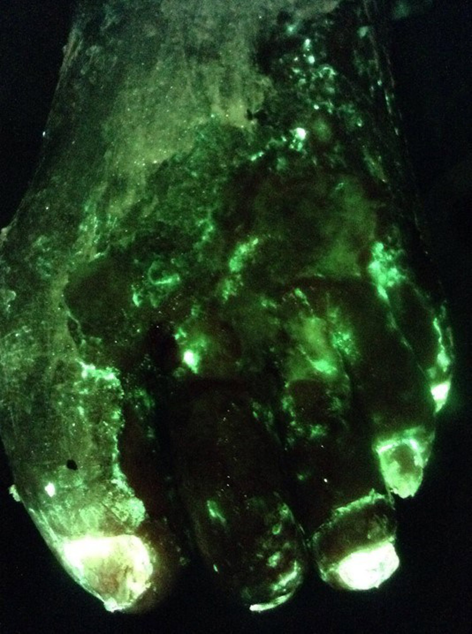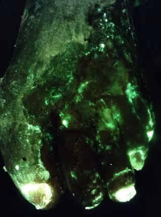 Este vídeo que muestra la limpieza de una úlcera del pie diabético es un ejemplo de la señal de fluorescencia cian de MolecuLight i: X que indica la probable presencia de PA. El cian es claramente visible en el pie del paciente (ver imagen), así como en la gasa después de la limpieza, lo que indica que la herida contiene niveles de PA clínicamente significativos (> 104 UFC/g):