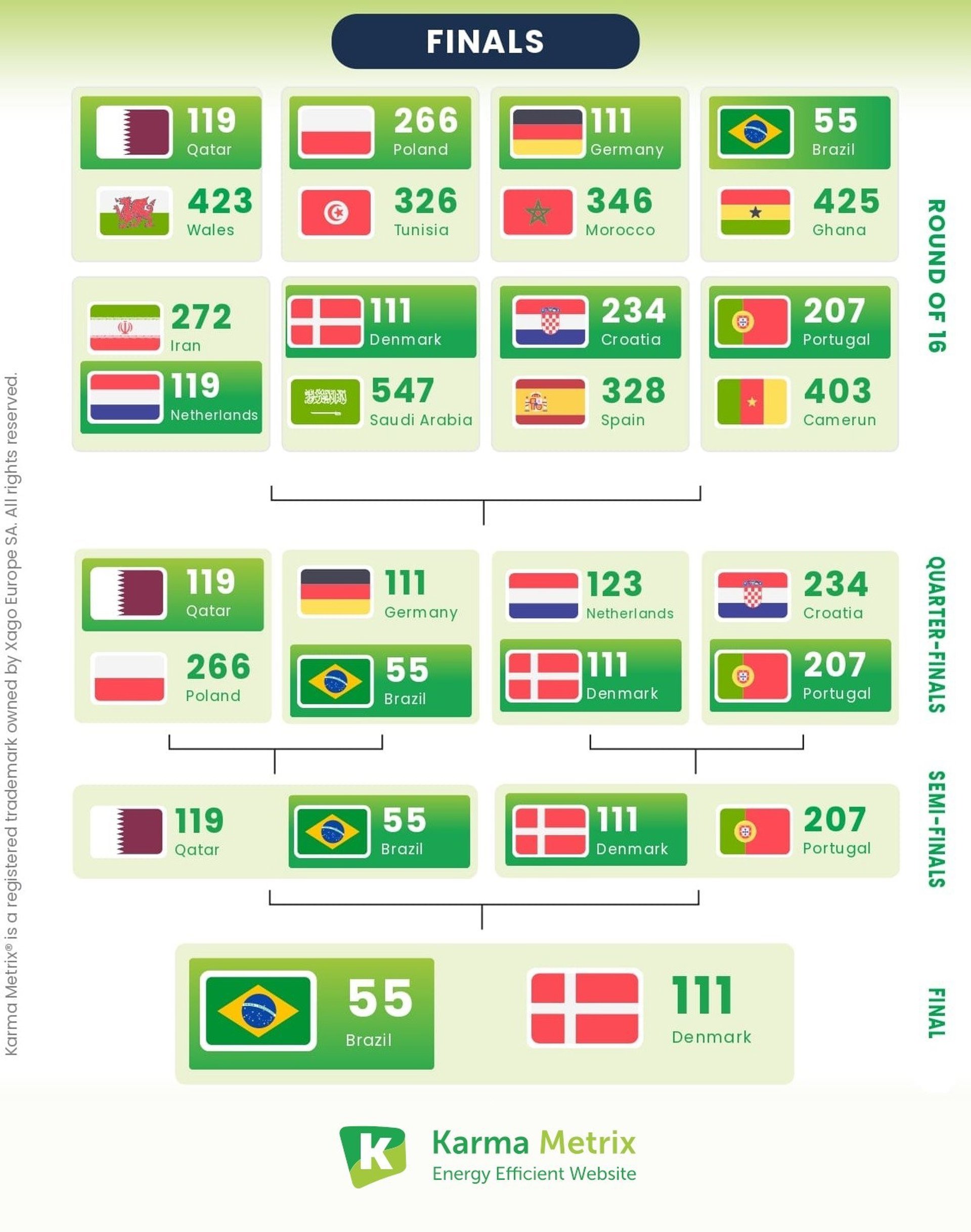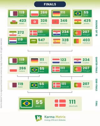 Los sitios internet contaminan emitiendo CO2; para aumentar la sensibilización del tema del "digital pollution", KarmaMetrix.com ha medido las emisiones de CO2 de las páginas principales de los sitios web de aquellos equipos que se han calificado para ganar la Copa del Mundo de fútbol FIFA en Qatar, simulando el marcador del Mundial, con los grupos e intersecciones exactamente cómo van a ser en Qatar.