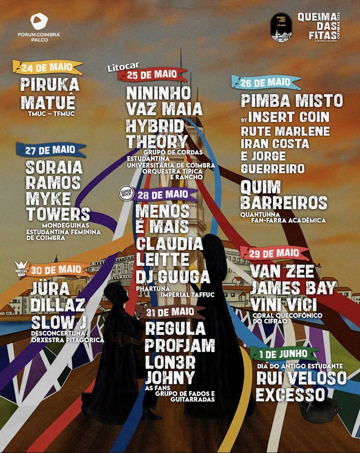 Queima das Fitas de Coimbra es una fiesta para todos los gustos musicales, con actuaciones de diferentes géneros, entretenimiento constante y un ambiente único de confraternización académica.