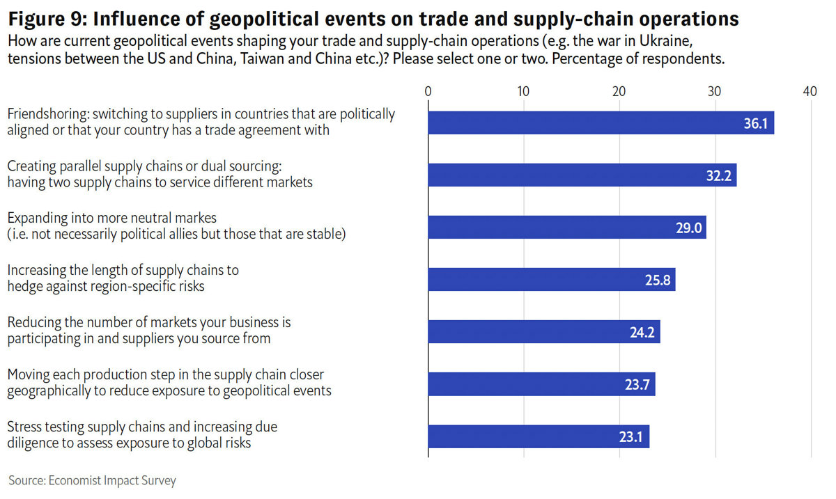 En la nueva era de la globalización, un panorama de mayor riesgo geopolítico está dando forma a los contornos del comercio global a medida que las empresas intentan reducir los riesgos en sus cadenas de suministro. Más de un tercio de las empresas están utilizando el friendshoring para dar forma a las operaciones comerciales y de la cadena de suministro, mientras que el 32% está creando cadenas de suministro paralelas o de abastecimiento doble.