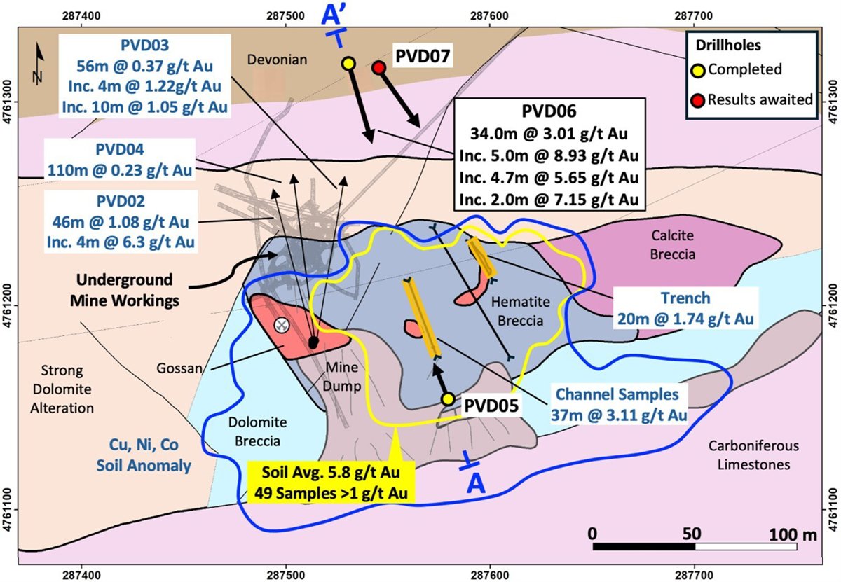- El sondeo PVD06 extiende la zona aurífera hasta 70 m al este del sondeo PVD02 (46 m con 1,08 g/t Au), quedando abierto al este, al oeste y en profundidad