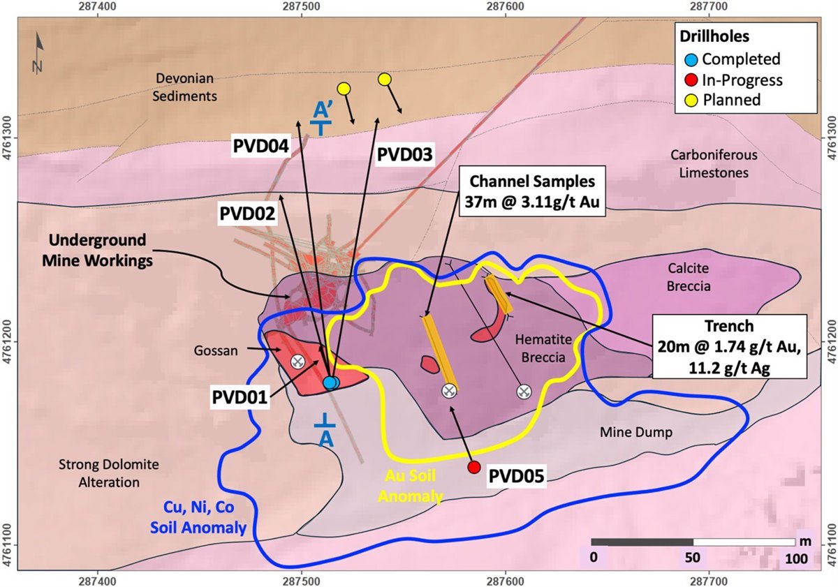 - La intersección de oro en PVD02 está asociada a una fuerte brecha hidrotermal multietapa dentro de calizas fuertemente dolomitizadas/alteradas, con trazas locales de sulfuros y contenidos muy bajos de metales penalizantes como arsénico o antimonio.