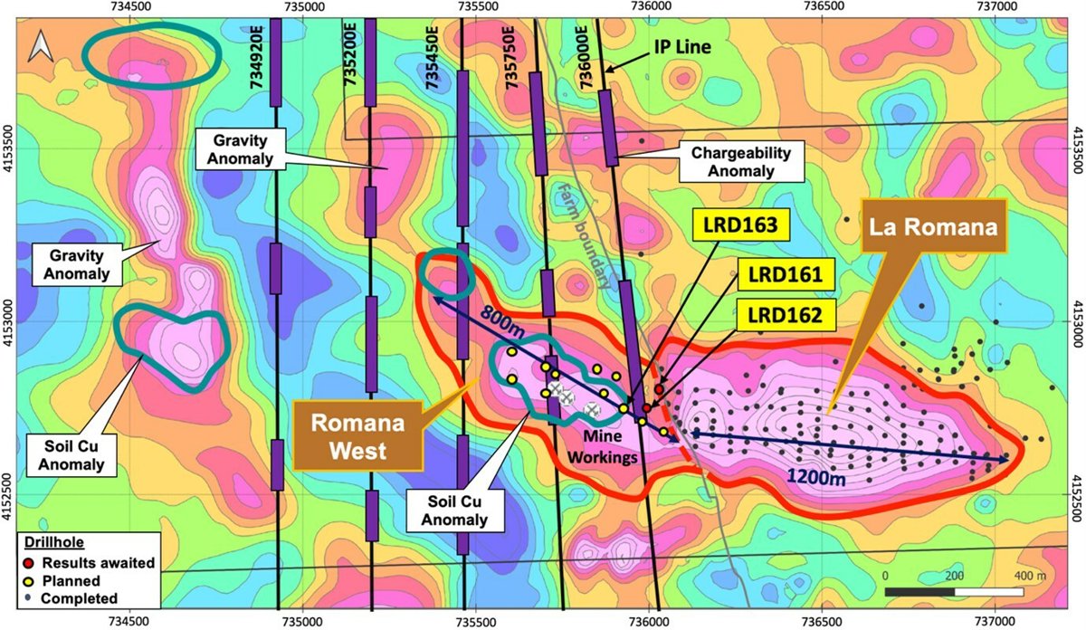En junio comenzó en Romana West una campaña de 25 a 30 sondeos (aproximadamente 6.000 m) con el objetivo de definir la extensión occidental de la mineralización poco profunda de La Romana. Se están realizando estudios geofísicos y geoquímicos para priorizar y afinar la ubicación de los sondeos. Están pendientes los ensayos de los dos primeros sondeos completados, LRD161 y LRD162. La mineralización visible de cobre y estaño y los conjuntos de alteración observados en estos sondeos confirman la continuación de la mineralización al oeste de La Romana. El sondeo LRD163, el más occidental hasta la fecha, está en curso, y se ubica aproximadamente 100 m al oeste de la extensión previamente conocida de la mineralización. Las ubicaciones de los sondeos y del objetivo se muestran en la Figura 1 a continuación, con dos nuevas líneas IP (Líneas 734920E y 735200E) que muestran anomalías de cargabilidad que continúan y amplían el objetivo 300 m hacia el oeste.