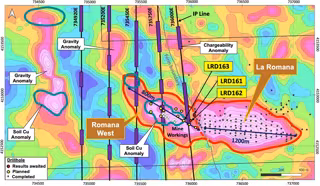 Figura 1 - Objetivos Romana West y La Romana - Mapa de anomalías gravimétricas con posición de sondeos (incluyendo los sondeos Romana Oeste LRD161 y LRD162 con resultados pendientes, y LRD163 en curso), ubicaciones de anomalías de cobre en geoquímica de - PAN GLOBAL RESOURCES INC./PR NEWSWIRE