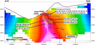 Figure 1 - Providencia Target IP Chargeability Cross-section showing a strong IP chargeability anomaly coincident with the former mine workings and gold drill intercepts, and the anomaly open at depth - PAN GLOBAL RESOURCES INC./PR NEWSWIRE
