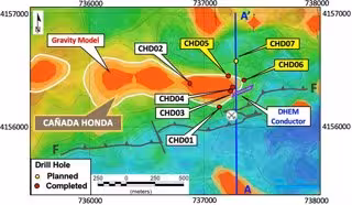 "El sondeo de seguimiento CHD06, a más de 100 m al este del sondeo CHD05, ha intersectado mineralización de cobre visible coincidente con una anomalía conductora EM de fondo de sondeo (DHEM), confirmando que la mineralización en Cañada Honda está abierta en todas direcciones."