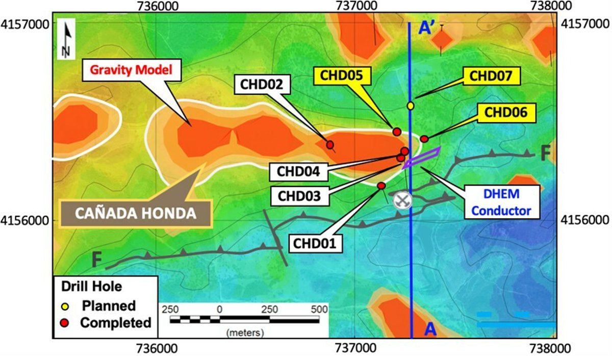 Cañada Honda, una de las más de 14 anomalías gravimétricas dentro del Proyecto Escacena, es un objetivo de alta prioridad tras los resultados de los sondeos comunicados el 1 de junio de 2023, que muestran un aumento de la mineralización de oro y cobre en profundidad en el flanco de una anomalía gravimétrica y DHEM de 2 km de longitud en rumbo este-oeste. El sondeo CHD05, el primero de un programa de tres sondeos de confirmación, se dirigió a la anomalía gravimétrica situada a 150 m en profundidad desde el sondeo anterior CHD04, y aproximadamente a 330 m de distancia siguiendo el buzamiento de la mineralización desde una galería histórica. Están pendientes los resultados del sondeo CHD06, situado a 100 m al este del CHD05, cuyo objetivo es una gran anomalía DHEM. El sondeo CHD07 está en curso y su objetivo es intersectar una anomalía de baja resistividad a 100 m en profundidad desde CHD05. El objetivo de Cañada Honda se encuentra aproximadamente a 3,5 km al norte del descubrimiento de cobre-estaño-plata de La Romana, dentro del Proyecto Escacena de Pan Global.