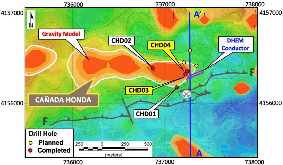 El nuevo procesamiento e interpretación de los datos gravimétricos sobre el objetivo de Cañada Honda muestra que los sondeos CHD03 y CHD04 se encuentran en el borde de una gran anomalía del modelo de inversión gravimétrica. Sobre la base de los alentadores resultados iniciales de perforación, se han planificado tres sondeos de seguimiento adicionales para comprobar las anomalías de gravedad e IP descendente desde CHD-04 y una anomalía de conductor DHEM al este de CHD04.