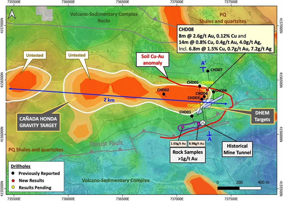 Figura 2 - Sección transversal A-A', que muestra resultados de ensayos seleccionados y geología simplificada del sondeo CHD08. La mineralización de cobre y oro coincide con los objetivos DHEM e incluye sulfuros semi-masivos y masivos dentro de una zona más amplia, de hasta 36 m de anchura y con buzamiento norte, de mineralización de stock-work y sulfuros diseminados.