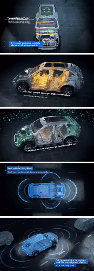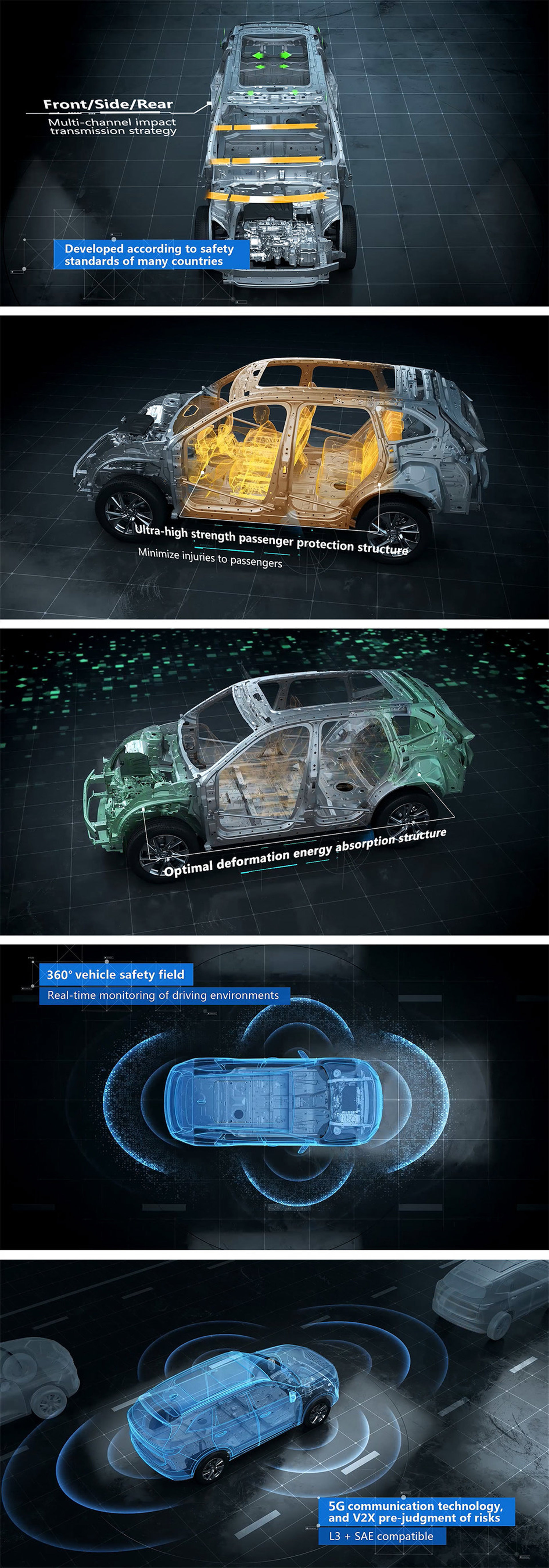 Con la vista puesta en el futuro y a la cabeza del mundo, la plataforma L.E.M.O.N. de GWM es una plataforma tecnológica modular altamente inteligente que cuenta con las siguientes ventajas: flexibilidad, alto rendimiento, alta seguridad y ligereza. El sistema de seguridad de la plataforma integra 18 escenarios de uso típicos recogidos de usuarios de todo el mundo y cumple estrictamente los requisitos de la calificación de seguridad de cinco estrellas de NCAP y la máxima calificación del IIHS ("Buena"). Se ha sometido a 124 tipos de pruebas de condiciones de funcionamiento y a más de 8.000 actualizaciones y optimizaciones de simulación virtual. Además de las normas y reglamentos internacionales mencionados, GWM también analiza y estudia condiciones de funcionamiento no estándar centrándose en escenarios de colisión reales de alta frecuencia. Como resultado, la plataforma L.E.M.O.N. es una de las pocas plataformas del sector que puede cumplir los requisitos de colisión más estrictos del mundo y mejorar la seguridad de conducción de los usuarios en todos los aspectos.