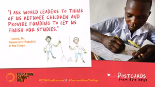 En su postal, Lucas hace un apasionado llamamiento a los líderes mundiales para que "piensen en nosotros, los niños refugiados, y nos proporcionen financiación para que podamos terminar nuestros estudios."