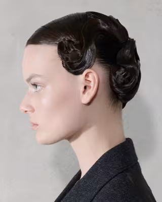 Lynsey Alexander starts by preparing the skin with Prada Skincare, employing Prada Augmented Skin The Essence as the first step. This transformative 2-in-1 toner and micro-peel essence optimizes and renews skin texture while gently exfoliating to prepare skin for the steps that follow. Next, Lynsey applies Prada Augmented Skin The Serum, a cream to water serum to even and refine the skin tone, before applying Prada Augmented Skin The Cream, ensuring its complete absorption before application of the base. Lynsey then applies Prada Reveal Foundation to achieve a naturally diffused, soft-matte finish. As the final step and to add dimension, Lynsey gently pads The Serum across the cheekbones to create a glossy veil, then dabs a minimal amount of Prada Monochrome Lipcolor in nude hues, mostly employing the B13 Marron for the runway, and the Prada Balm for a diffused glow on the cheeks.