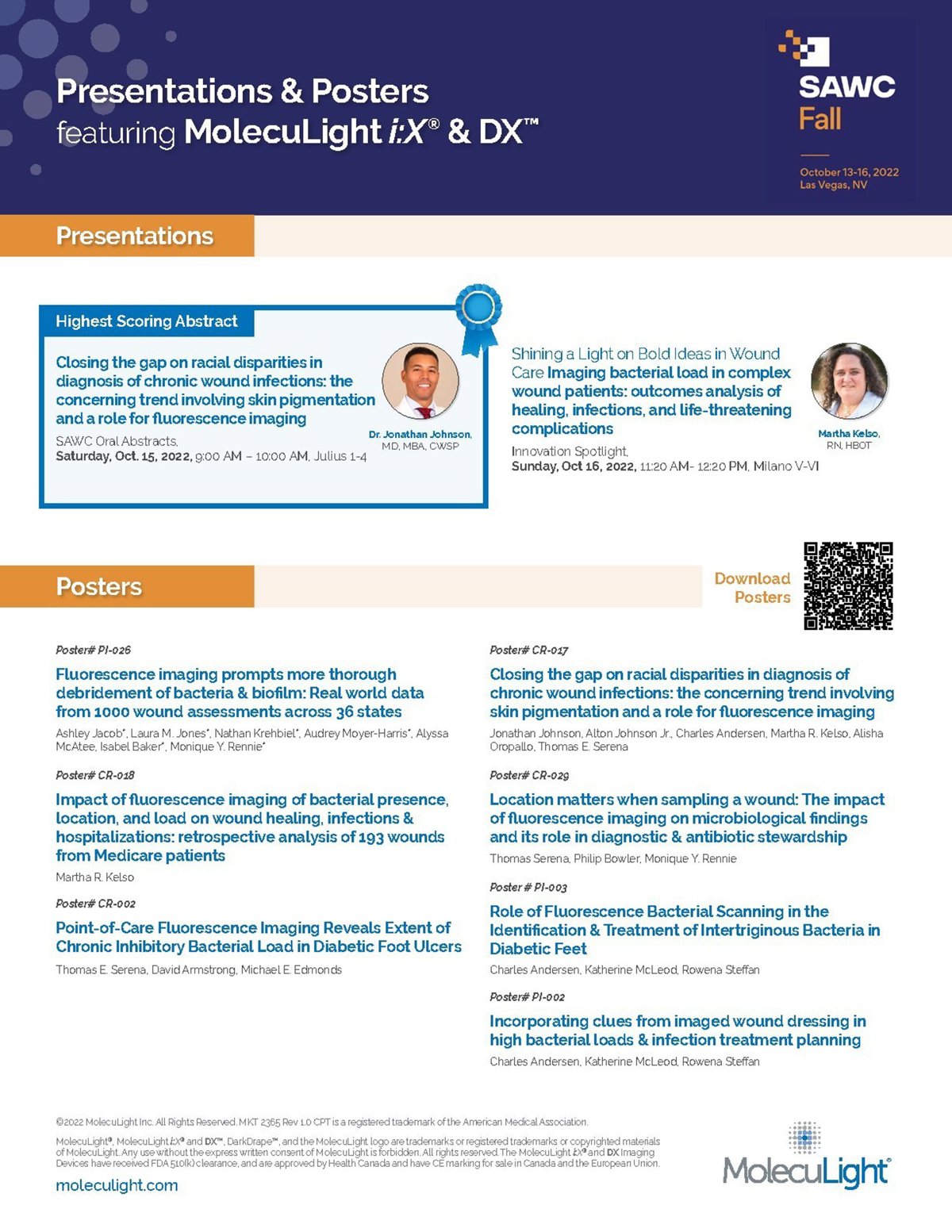 Las presentaciones clínicas y los pósteres de MolecuLight i:X y DX en SAWC Fall 2022 son los siguientes: