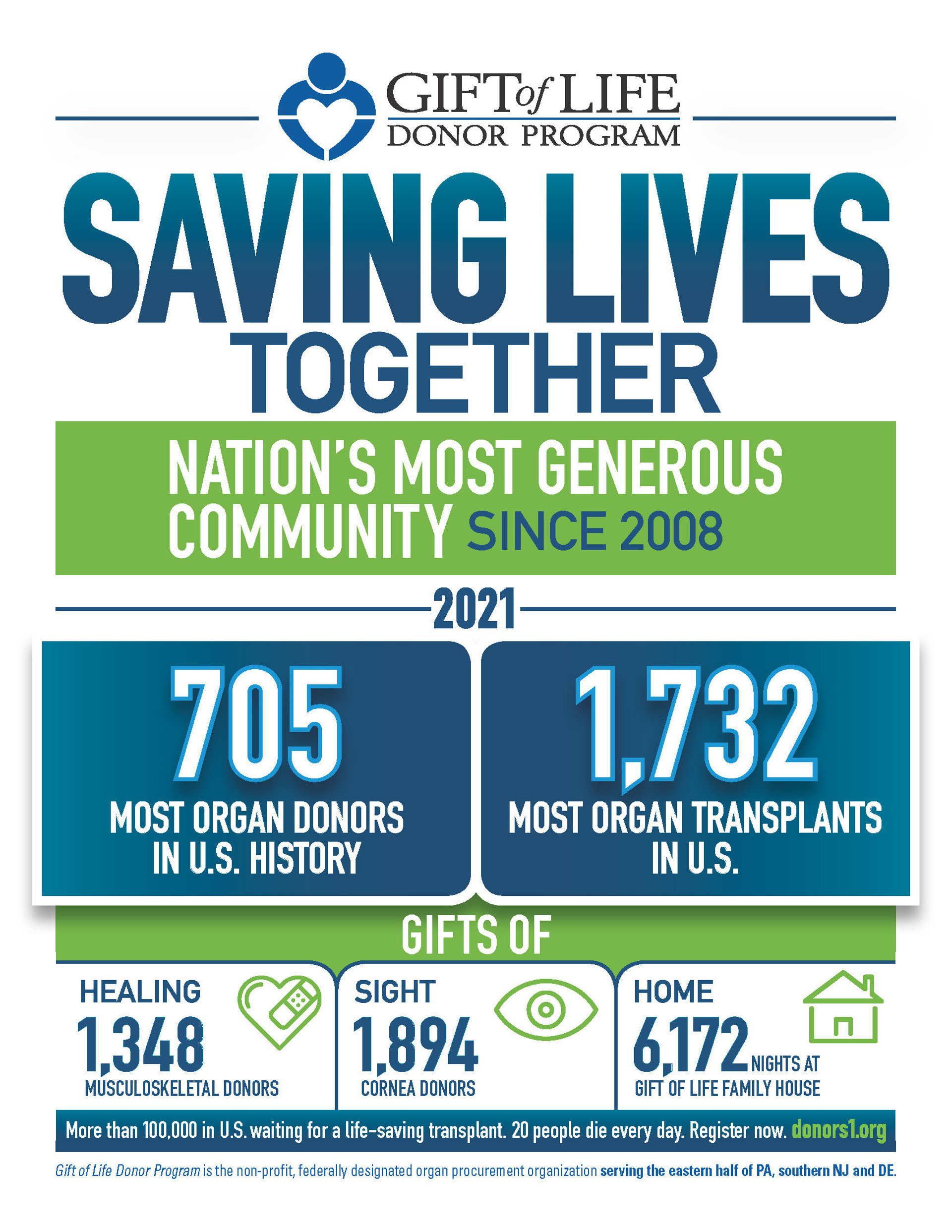 Con sede sita en Filadelfia, el programa Gift of Life Donor es la OPO designada por el gobierno federal que sirve a la mitad este de Pensilvania, el sur de Nueva Jersey y Delaware. La tasa de donación anual de Gift of Life, 62 donantes de órganos por millón de habitantes, se encuentra entre las más altas del mundo.