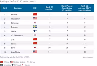 - InterDigital (US) ocupa el puesto 14 cuando solo se consideran familias de patentes, pero salta al quinto lugar en la clasificación de patentes de propietarios finales de 5G cuando se utiliza el Índice de Activos de Patentes.