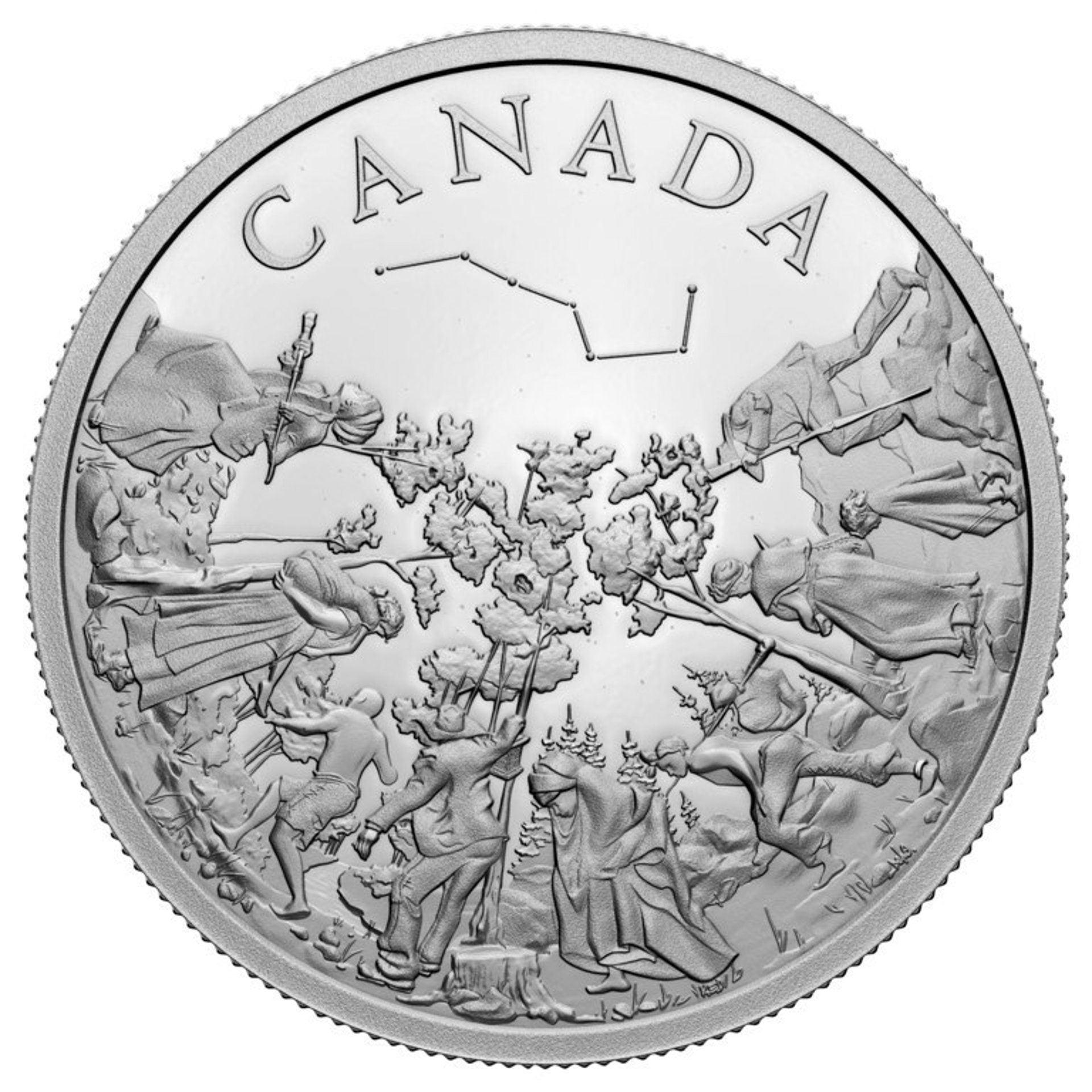 El diseño del reverso de esta moneda de plata pura al 99,99 % es un tributo innovador a quienes viajaron por el Ferrocarril Subterráneo. Los hombres, mujeres y niños que siguen la constelación de la Osa Mayor para guiar su camino hacia el norte hacia la libertad, se ilustran a lo largo del borde de la moneda con el objetivo de poder crear la sensación de movimiento circular que representa su largo y continuo viaje. El anverso presenta la efigie de Su Majestad la Reina Isabel II de Susanna Blunt, en contraste con un patrón repetitivo de hojas de arce.