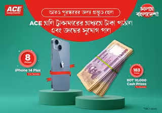 "ACE Money Transfer regala 8 flamantes iPhones 14 Plus a los remitentes de remesas de Reino Unido, Europa, Canadá, Australia y Suiza, y 183 premios en metálico de 10.000 BDT cada uno a los receptores de remesas de Bangladesh, hasta el 31 de octubre de 2023. Cada envío de dinero a Bangladesh desde los países mencionados antes de la fecha límite entrará automáticamente en el sorteo".