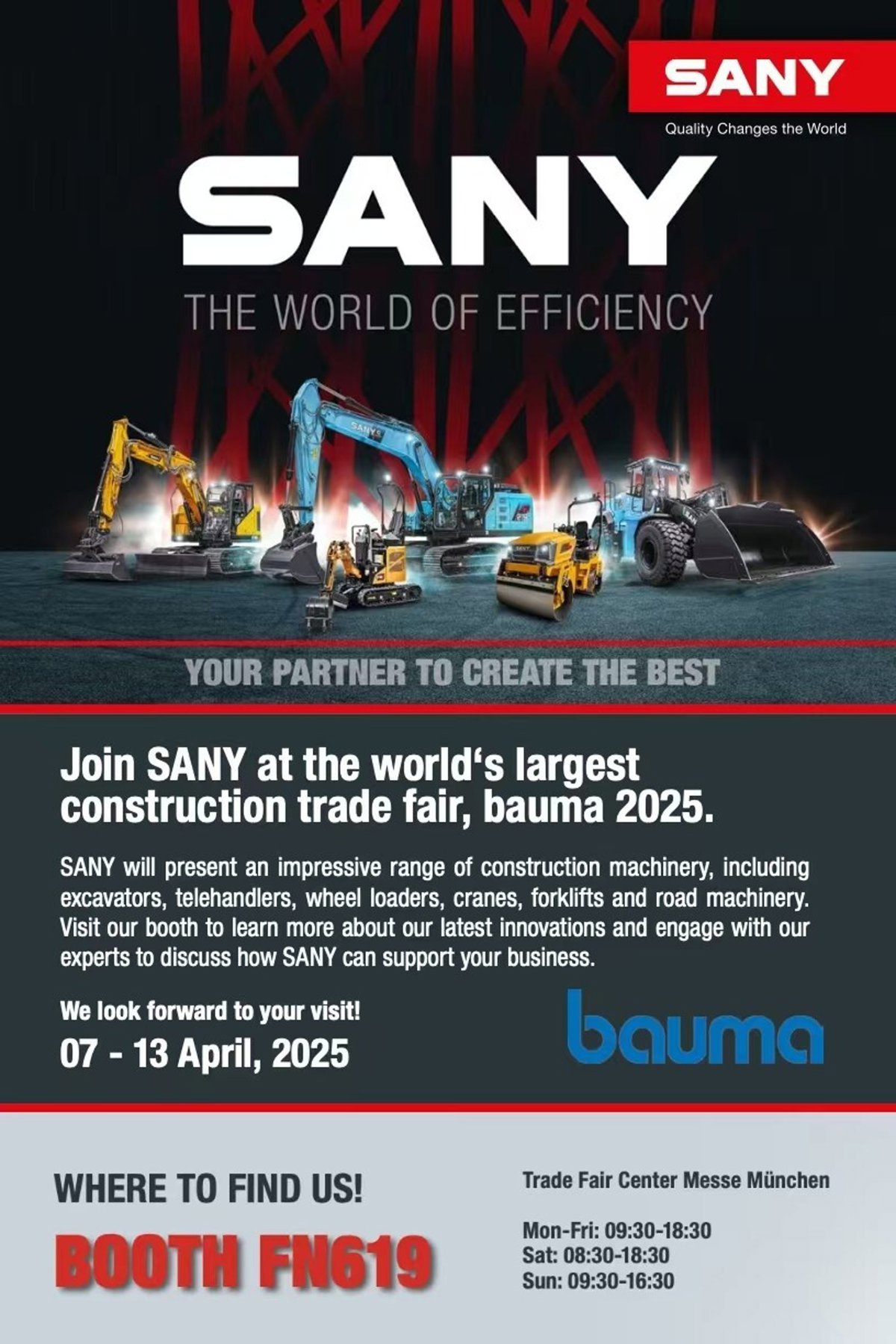 Con productos innovadores, tecnología de vanguardia y un servicio excepcional, SANY demostrará su formidable fortaleza y potencial ilimitado en el campo de la maquinaria de construcción. Visitantes de todo el mundo están invitados a explorar el stand de SANY y a ser testigos del futuro inteligente, ecológico y eficiente de la industria de la maquinaria de construcción. Únase a nosotros y experimente "El Mundo de la Eficiencia" que le ofrece su socio SANY.