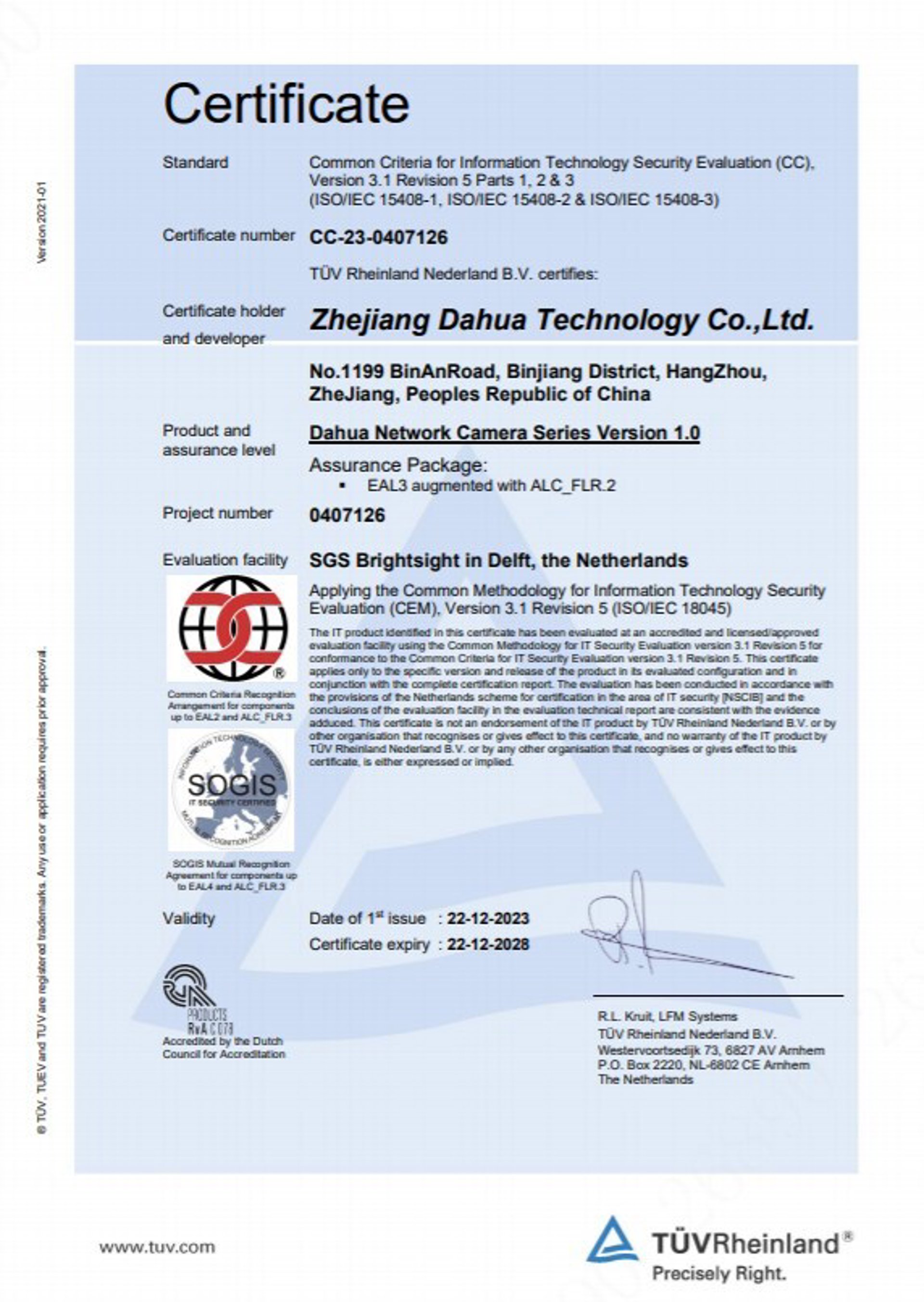 HANGZHOU, China, 20 de mayo de 2024 /PRNewswire/ -- Dahua Technology, proveedor líder mundial de soluciones y servicios AIoT centrados en el vídeo, se enorgullece de anunciar que sus cámaras de red han obtenido con éxito el certificado Common Criteria (CC) EAL 3+. Este logro demuestra la dedicación de Dahua a ofrecer soluciones seguras y fiables que cumplen con los más altos estándares de seguridad de la información y las mejores prácticas de la industria.