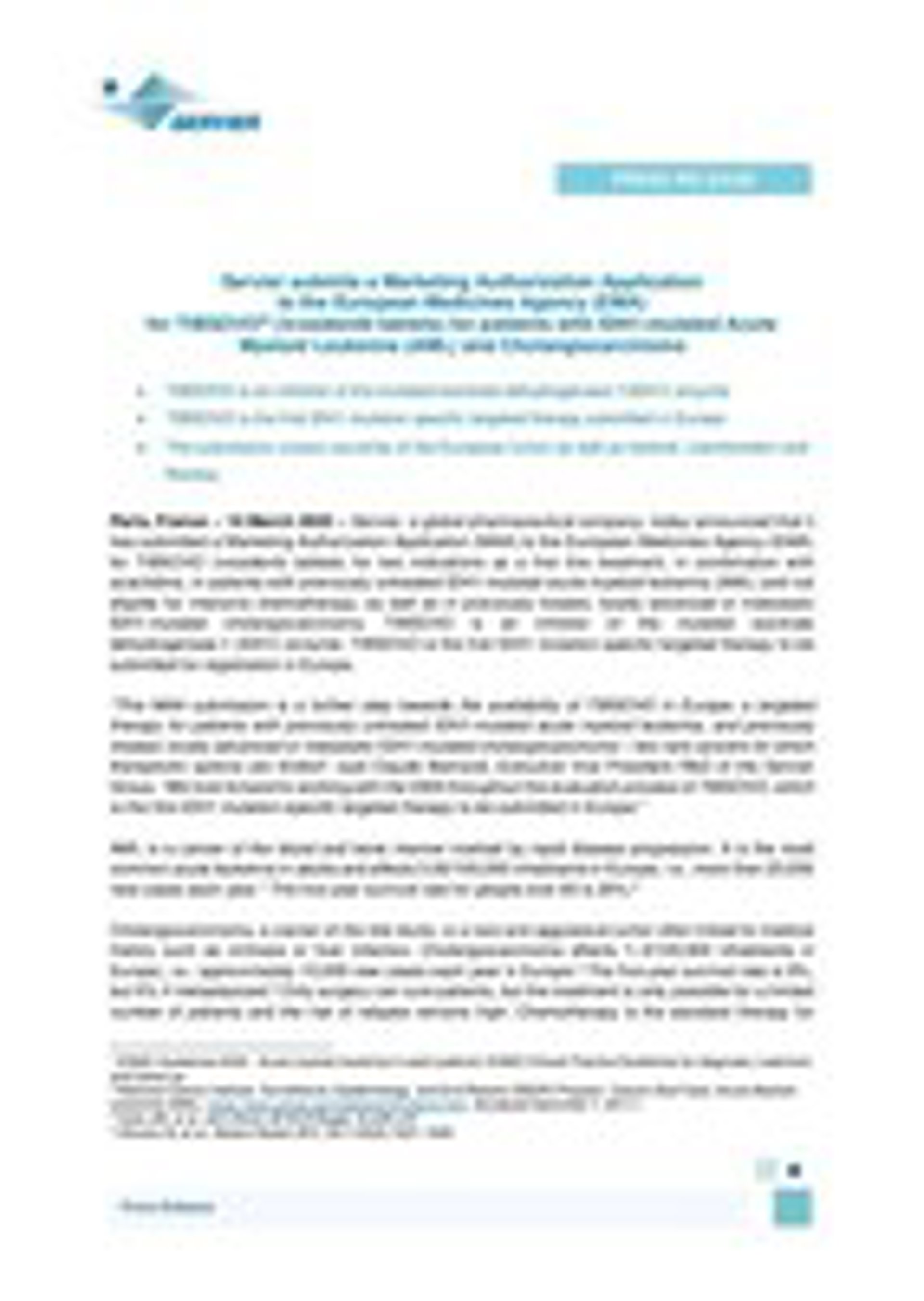 PARIS, March 10, 2022 /PRNewswire/ -- Servier, a global pharmaceutical company, today announced that it has submitted a Marketing Authorization Application (MAA) to the European Medicines Agency (EMA) for TIBSOVO (ivosidenib tablets) for two indications as a first line treatment, in combination with azacitidine, in patients with previously untreated IDH1-mutated acute myeloid leukemia (AML) and not eligible for intensive chemotherapy, as well as in previously treated, locally advanced or metastatic IDH1-mutated cholangiocarcinoma. TIBSOVO is an inhibitor of the mutated isocitrate dehydrogenase-1 (IDH1) enzyme. TIBSOVO is the first IDH1 mutation specific targeted therapy to be submitted for registration in Europe.