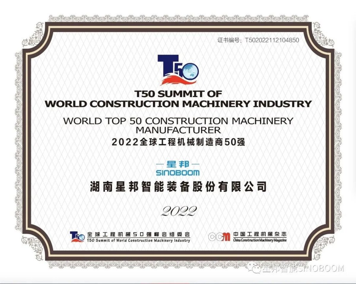 CHANGSHA, China, 5 de diciembre de 2022 /PRNewswire/ -- El 21 de noviembre, se celebró con éxito en Shanghái la Cumbre de los 50 Principales Fabricantes de Maquinaria de Construcción del Mundo de 2022. Sinoboom fue bienvenida en la lista anual de los 50 mejores fabricantes de maquinaria de construcción del mundo, entrando en el número 48.