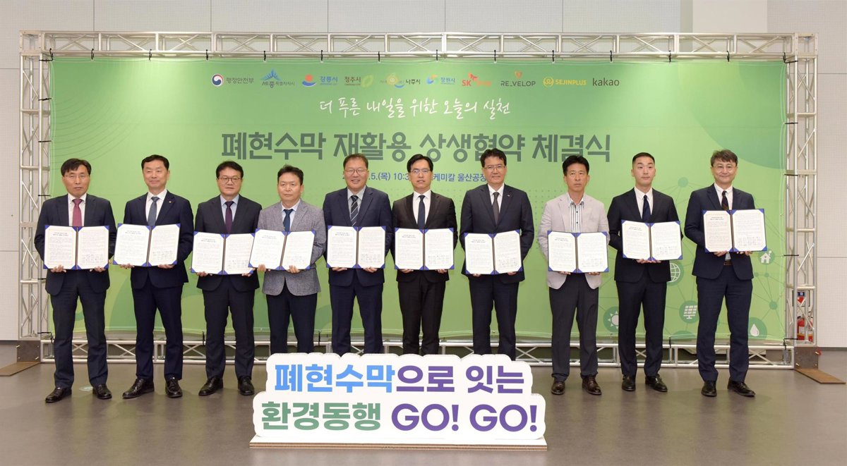 SK chemicals (presidente y consejero delegado Ahn Jae-hyun) anunció el día 5 la firma de un Memorando de Entendimiento (MOU) sobre el reciclaje de pancartas desechadas para la prosperidad conjunta regional y corporativa en su Planta Ulsan en Nam-gu, Ulsan, junto con cinco gobiernos locales, REVELOP, Sejinplus y Kakao.