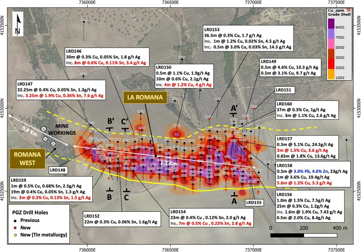 VANCOUVER, BC, 23 de agosto de 2023 /PRNewswire/ -- Pan Global Resources Inc. ("Pan Global" o la "Compañía") (TSX-V: PGZ; OTCQX: PGZFF) se complace en informar de los resultados de 15 sondeos en el yacimiento de La Romana en el Proyecto Escacena, propiedad al 100% de la Compañía, en la Faja Pirítica Ibérica, sur de España. La Romana constituye una zona coherente de mineralización de cobre-estaño-plata con buzamiento moderado hacia el norte, actualmente definida en aproximadamente 1,2 kilómetros de extensión y hasta 400 m siguiendo el buzamiento en profundidad. Se está llevando a cabo un programa de perforación de 25 sondeos para ampliar y verificar la extensión hacia el oeste de la mineralización superficial en el área de Romana Oeste.