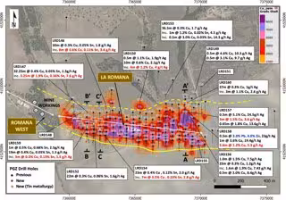 "En Romana Oeste seguimos alentados por la mineralización visible de cobre y estaño que se observa en los testigos desde los primeros sondeos en esta zona de alto potencial, que representa la posible extensión hacia el oeste de la mineralización de cobre-estaño-plata de La Romana."