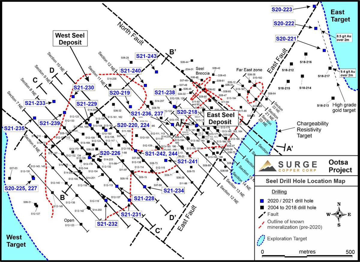- Los pozos S21-231 y 234 chocan con mineralización de alta ley en el lado sureste de West Seel, incluyendo 0,70% de cobre equivalente a 62 metros y 0,62% de cobre equivalente a 86 metros