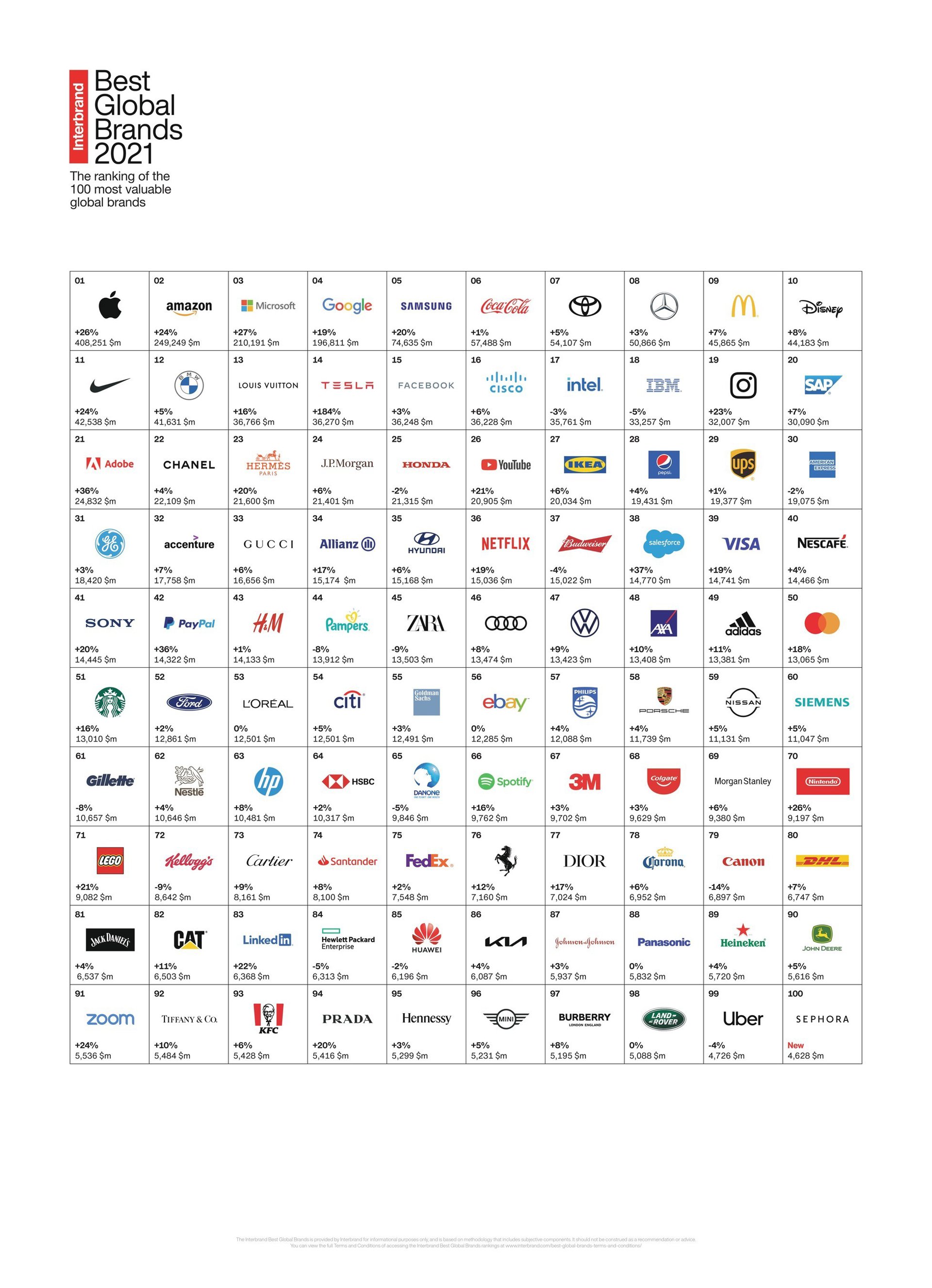A pesar de su crecimiento sísmico, Tesla aún no ha entrado entre los diez primeros. Apple n 1 (408.251 millones de dólares) vuelve a ocupar el primer puesto de la tabla, seguida de Amazon n 2 (249.249 millones de dólares). Tras haber superado a Google en 2020, Microsoft n 3 (210.191 millones de dólares) ha conservado su lugar entre los tres primeros. Las tres primeras marcas representan un tercio (33%) del valor total de la tabla este año.