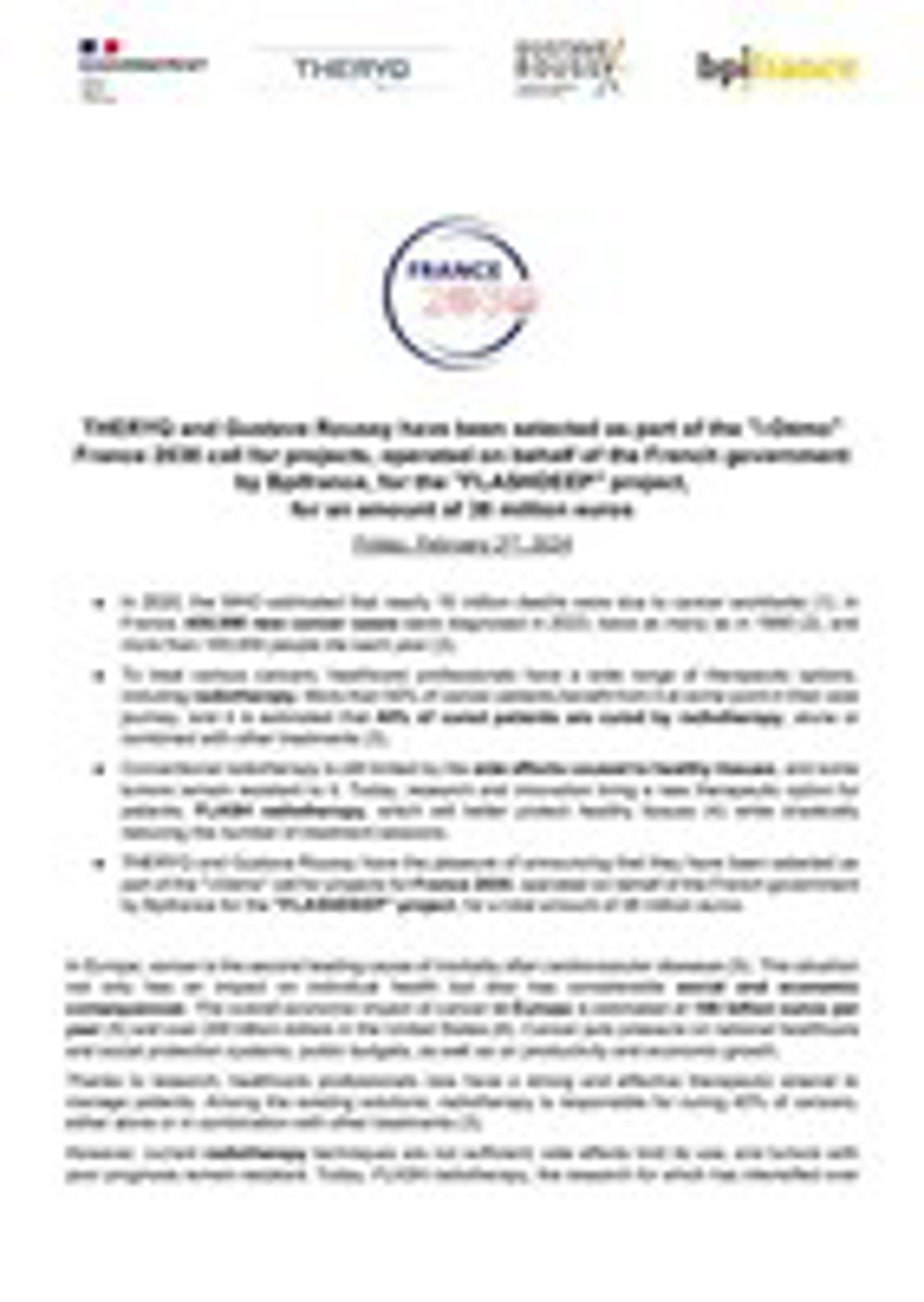 THERYQ y Gustave Roussy han sido seleccionados en el marco de la convocatoria de proyectos "i-Démo" France 2030, gestionada por Bpifrance en nombre del gobierno francés, para el proyecto "FLASHDEEP", por un importe de 38 millones de euros.