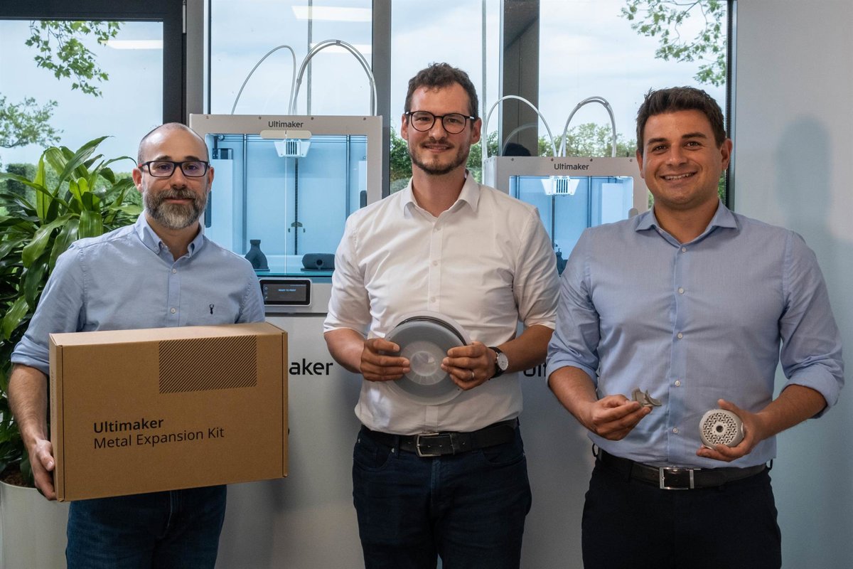 F.l.t.r. Miguel Calvo (CTO Ultimaker); Tobias Rdlmeier (Business Development Manager - Metal Ecosystem at BASF Forward AM); Andrea Gasperini (Product Manager Ultimaker) presenting components of the Ultimaker Metal Expansion Kit, co-developed by Ultimak - ULTIMAKER/PR NEWSWIRE