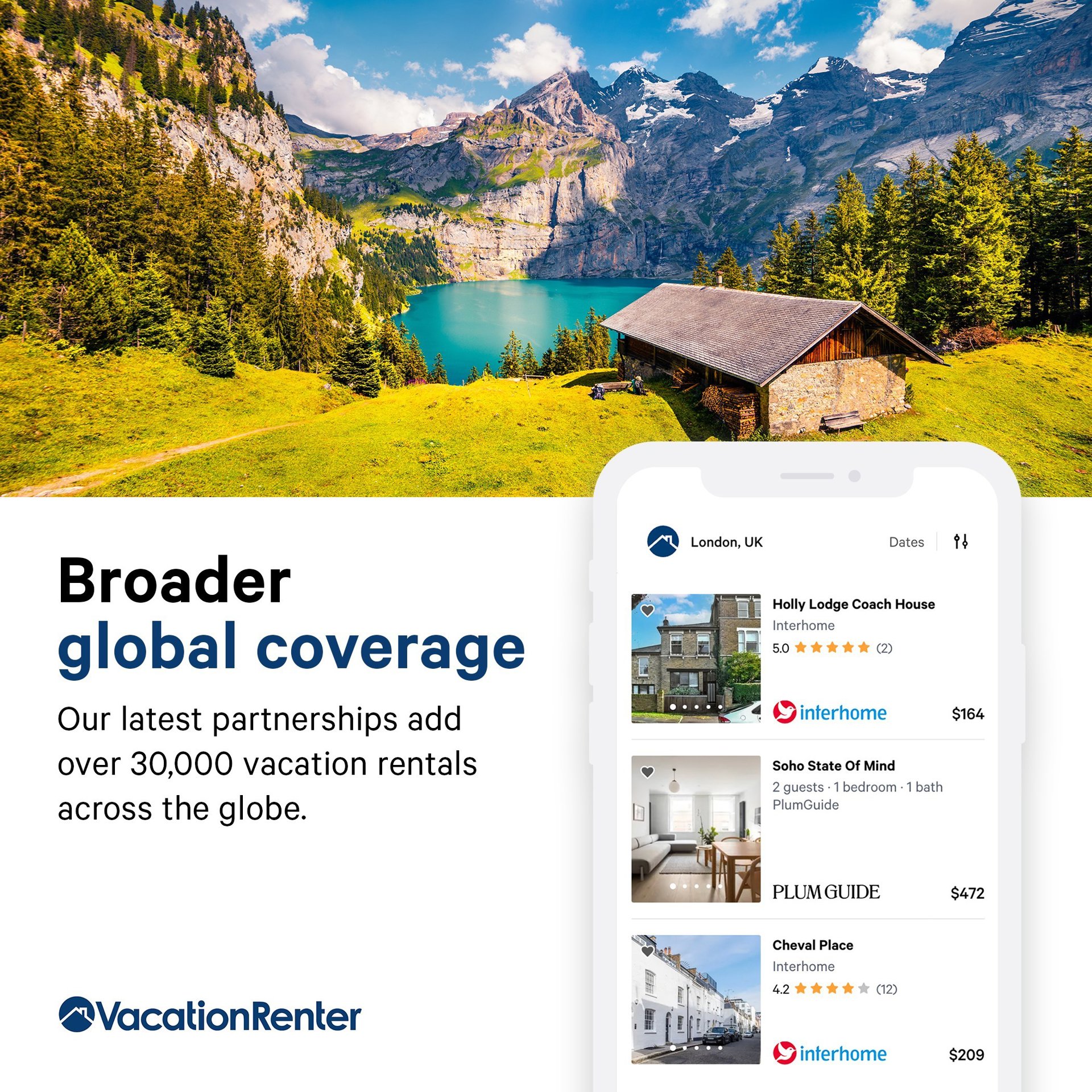 Interhome es la última incorporación a las diversas y sólidas asociaciones de VacationRenter. El sitio web de alquileres con sede en Suiza ofrece más de 30.000 alquileres vacacionales en Europa y EE.UU. Estas casas y apartamentos aumentan los alquileres en destinos turísticos muy solicitados, como Myrtle Beach, SC y Madrid, España.